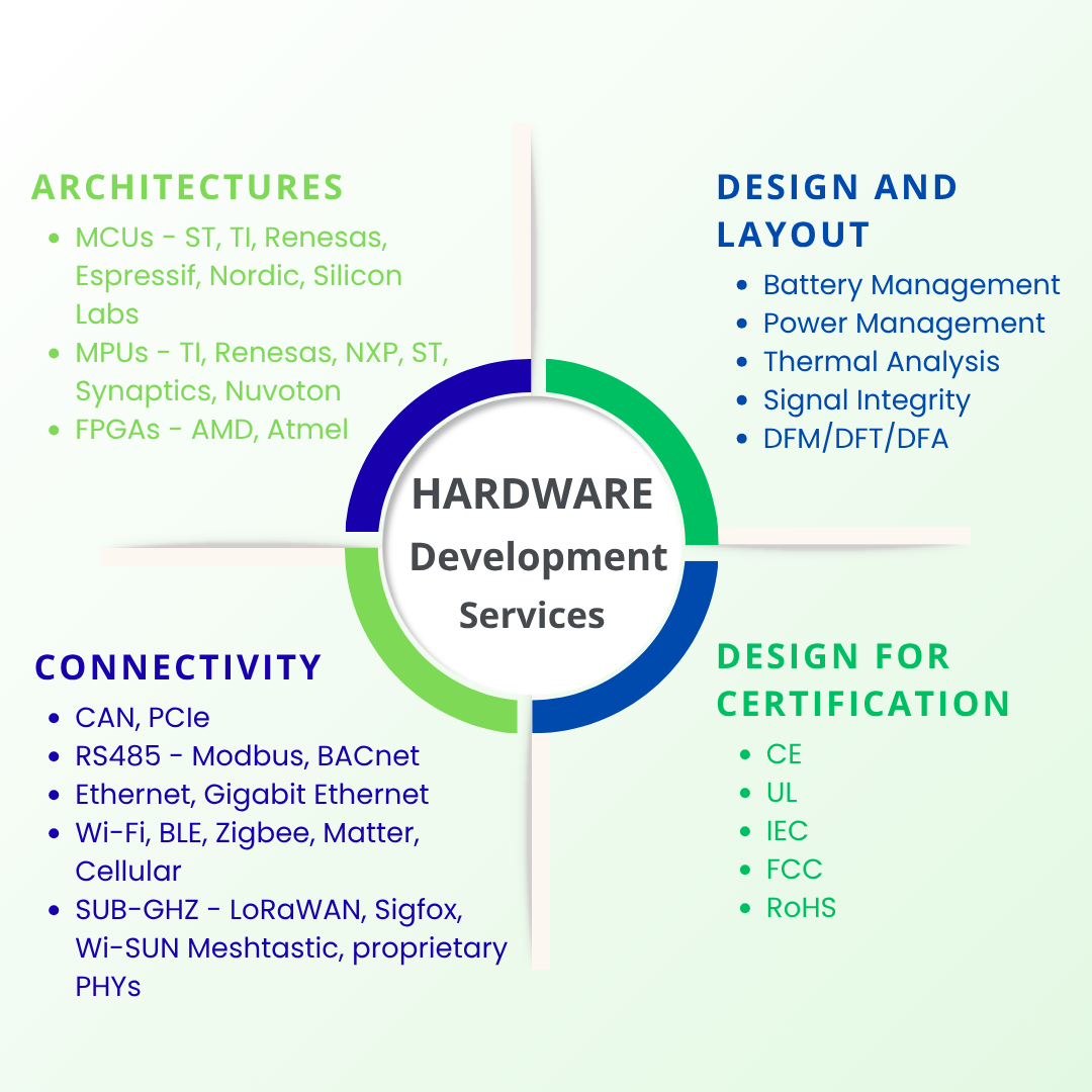 We offers comprehensive electronic design services covering the entire product development cycle. From design creation, verification, and signal integrity analysis to thermal and structural optimization, product ruggedization, and prototyping, we deliver end to end solutions that ensure robust and reliable hardware. With years of expertise in diverse hardware design and development projects, supported by our strong network of qualified PCB and mechanical fabrication partners, we help customers bring innovative products to life. Our capabilities include PCB layout and analysis, analog and digital design, power optimization, FPGA development, RF and antenna design, and advanced wireless solutions.