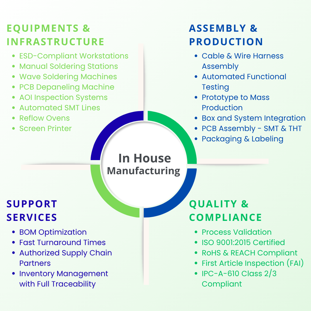 Our in-house manufacturing capabilities enable us to support customers from concept to finished product. We specialize in low to medium volume production of complex electronic assemblies, ensuring high quality and quick turnaround times. Our facilities are equipped for PCB assembly, testing, and system integration, allowing us to manage prototypes as well as production runs with precision and flexibility. By keeping manufacturing in-house, we maintain tighter control over quality, reduce lead times, and quickly adapt to design changes. This integrated approach helps our customers accelerate their product development cycles while ensuring reliable and consistent delivery