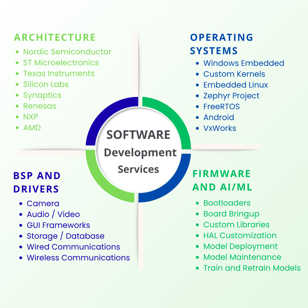 We deliver comprehensive software development services that complement our hardware expertise. Our team works on everything from Linux BSP development and device drivers to application frameworks, ensuring seamless hardware software integration and optimized system performance. We have strong experience in microcontroller firmware development, whether it’s bare metal programming for resource constrained devices or RTOS-based solutions for complex real time applications. We also help customers harness the power of AI and Machine Learning at the edge, building smarter, data driven embedded products. With a focus on reliability, scalability and faster time to market, we support our customers through rapid prototyping, validation and deployment of robust embedded software.