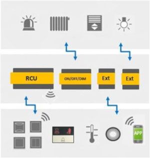 RCU has both wired and wireless connectivity option to interfaces with Actuators and control elements such as Switches and Tabs. Lighting control is mainly based on ON/OFF and Dimming method, where as IR Blasters or FCU interface units are supported to control Air-conditioning system.